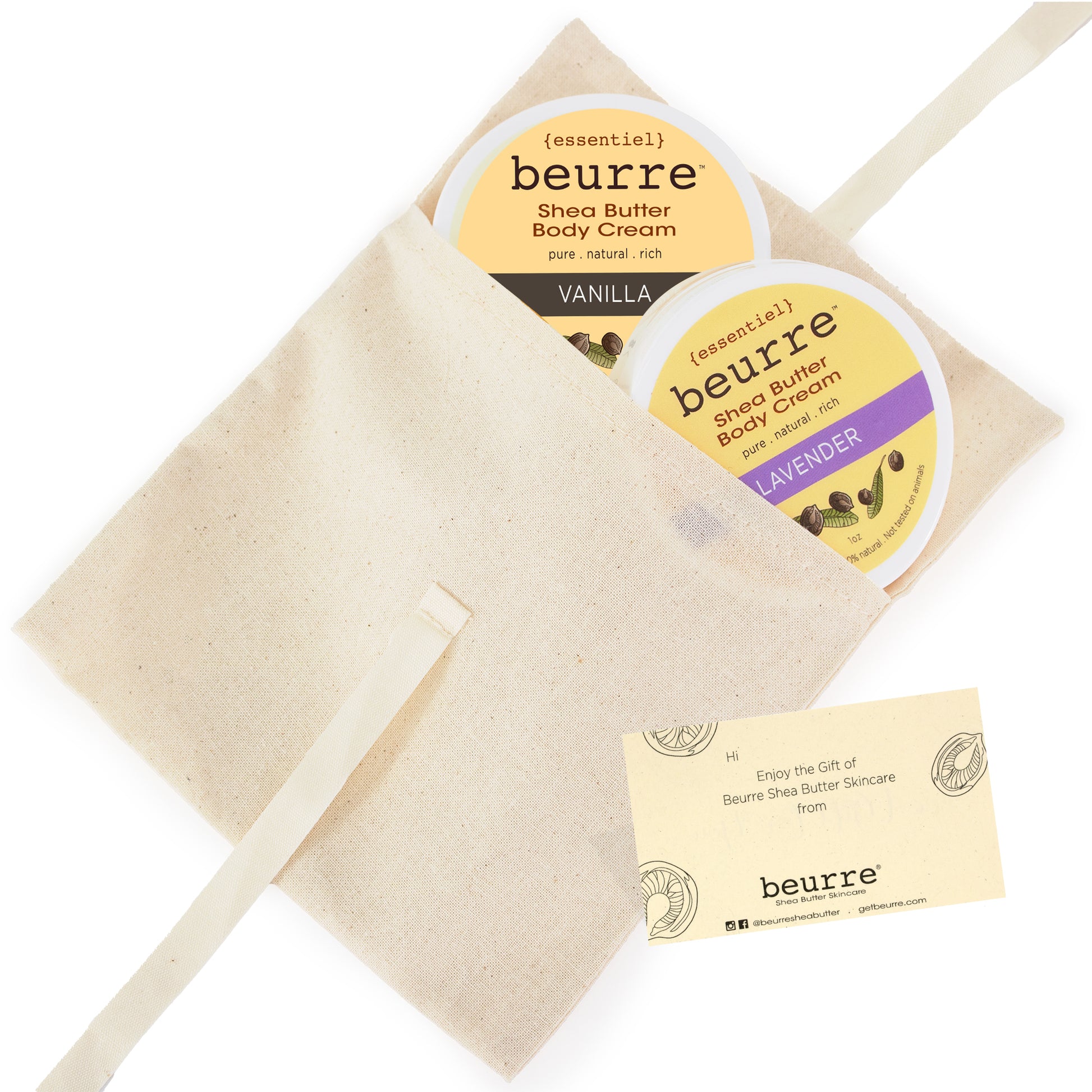 Treat someone special (or yourself) to Beurre’s pure shea-butter glow in a petite, giftable set. Each pouch holds two 1oz jars of our best-selling body creams — choose your favorite scents or let us surprise you.